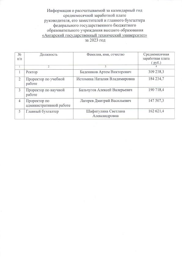 Справка о среднемесячной заработной плате ректора, проректоров и главного бухгалтера федерального государственного бюджетного образовательного учреждения высшего образования «Ангарский государственный технический университет» за 2023 год