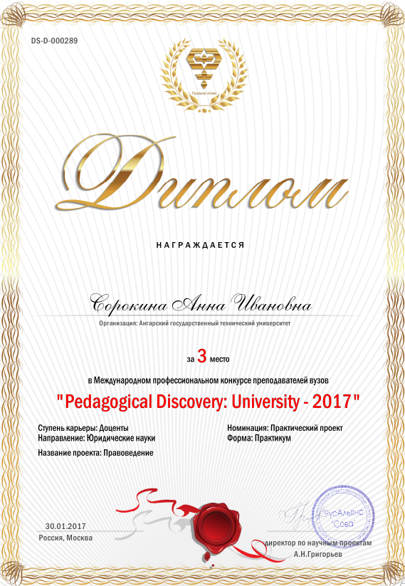 Поздравляем доцента кафедры экономики, маркетинга и психологии управления Сорокину Анну Ивановну, занявшую 3 место в Международном профессиональном конкурсе преподавателей ВУЗов «Pedagogical Discovery: University– 2017» в номинации «Практический проект» по направлению «Юридические науки», проходившего в г. Москва.